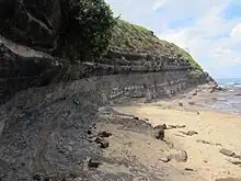 Coal seam outcrop at Bell's Point, at the northern end of Austinmer Beach. This is the coal seam noted by George Bass in 1797.