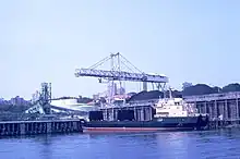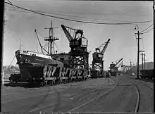 The Carrington coal port used twelve hydraulic cranes powered by water under pressure supplied from a pumphouse nearby.[101] There were also three steam cranes, which had been relocated from Queens Wharf.[57] In 1890, this government-operated facility was capable of loading a total of 12,000 tons per day. The first electric cranes were commissioned at the Basin, in 1916, but at the end of that year needed to be shutdown for a short time, while the power supply was improved. By mid 1917, there were six electric cranes there.[102][103][104]