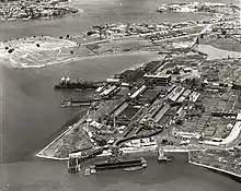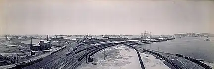 The first wharves on the Basin were those on the eastern side, opposite the wharves of the Dyke.[95] At first, the Basin was used as mooring and as a location to unload ballast. By mid-1903, two—of eventually six—coal loading cranes were operating there,[98] essentially as an extension to the loading operations of the Dyke. In 1913, work was underway on another line of wharves, on the western side of the Basin.[99] Those new wharves were completed in 1915.[100]