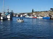 The shallowness of the entrance to the Hunter River continued to be a limitation on shipping into the 1920s[51] and a hazard during bad weather.[52] Work continued to improve the river mouth, during the 1930s, culminating in the excavation of a deep channel 600 feet wide, with 27 feet of water depth, effectively removing the rock bar at the river's mouth.[53][54] The improvements to the river entrance were a major engineering project for their time and a paper on the work won a Telford Premium award from the Institution of Civil Engineers for Percy Allan in 1921.[55]