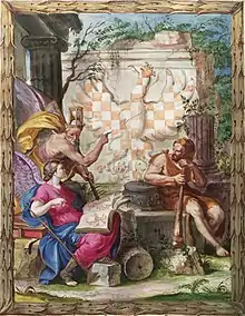 Illustration from Antonín Martin Lublinský 1671 Book of Knights. The Muse of Historiography Kleió for future generations captures the drawing and colors of the Moravian eagle. Chronos on the left, who is the personification of time in pre-Socratic philosophy and later literature, points to a red-and-white checkered eagle, which is its model, as observed by King Marobud on the right.