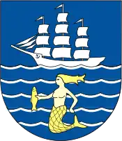 - W błękitnym polu tarczy żaglowiec trójmasztowy srebrny (z rozwiniętymi żaglami i o złotych pennantach na szczytach masztów), na falach o srebrnych grzywach. Poniżej, u podstawy tarczy, syrena ukoronowana złotą koroną, o złotych włosach i złotym (rybim) ogonie, z lewą ręką na biodrze, prawą – ujmująca dłonią rybę srebrną (łososia ).[2]