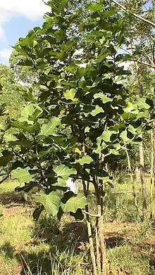 This is a small to medium tree, often with multiple trunks, puberulent to glabrescent stems. The leaves are broadly oblong or suborbicular, rounded to truncate to subcordate at the base.