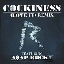 "Cockiness (Love It)" was officially remixed featuring a guest appearance from American rapper and music video director ASAP Rocky, rapping the first verse. The song was digitally released on September 7, 2012, as the sixth and final single from Talk That Talk.[30] On September 4, 2012, via her Twitter account Rihanna streamed the official remix of "Cockiness (Love It)" through her MTV page.[31] On September 6, 2012, Rihanna and ASAP Rocky performed the remix at the 2012 MTV Video Music Awards in a medley with "We Found Love".[32]