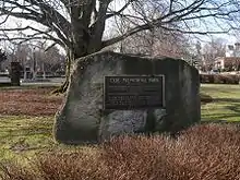 A great drama was made of the selection of a boulder upon which to place the memorial plaque for the Coes. The selected boulder weighed 15 tons and was moved through the center of town to the Park on the logging wagon pulled by twenty horses. The Civil War monument was originally erected in front of Town Hall in 1879 and was moved to Coe Memorial Park in 1936.