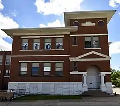 The chosen terminus for the community's Main Street in 1884 was its schoolhouse. A school building has remained on this property ever since.[2] The 1890 school building was replaced by the first section of this building in 1909. Cedar Rapids architect R.R. Mayberry designed the two-story brick structure with Neoclassical styling, and A.J. Bruce was the contractor who built it. Cedar Rapids architect W. Jay Brown designed a 1936 addition in an industrial style and Des Moines architect N. Clifford Prall designed a 1957 addition in the Modern style.