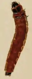 The larvae feed on Vicia cracca. They create a large, blackish pistol case, almost entirely covered by a transparent pallium.[2]
