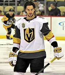 On May 28, 2018, Miller scored the first-ever Stanley Cup Finals goal in the Golden Knights' history during the first period of game 1 of the 2018 Stanley Cup Finals.[7] During game 4 of the Stanley Cup Finals, Miller was hit in the face by T. J. Oshie subsequently breaking his nose.[8] The Washington Capitals ended up winning the Stanley Cup the following game. Miller ended both the regular and postseason setting career highs in goals, assists, and points.