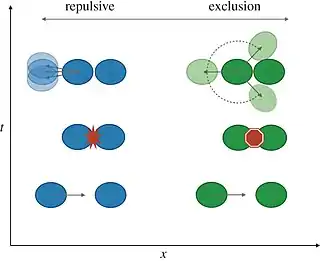 Spectrum of cell–cell interactions, from repulsive interactions (left, blue) to volume exclusion (right, green). With repulsive interactions, cells move away from the point of contact with another cell (second cell shown as stationary for simplicity). With volume exclusion, cells block each other's movement, but can move to any space not occupied by another cell.[25]