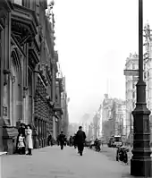 During the 1950s and 1960s, the street became subject to extensive redevelopment and many historic buildings were demolished by Whelan the Wrecker, despite the efforts of the National Trust and the Save Collins Street group.[9] While some examples of Boom Style architecture survive, the grandest examples were lost to the wrecker's ball.[10] Of the major losses, the most significant were the large Victorian buildings including the Federal Coffee Palace, Colonial Mutual Life building, Robb's buildings, Queen Victoria Buildings, City of Melbourne Bank, Scott's Hotel, Melbourne Mansions and APA building.[1] Many of the buildings destroyed in this era were documented by architectural photographer Mark Strizic and can be found in the archives of the State Library of Victoria.