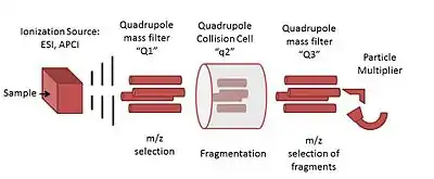 Unlike traditional MS techniques, MS/MS techniques allow for mass analysis to occur in a sequential manner in different regions of the instruments.[4] The TQMS follows the tandem-in-space arrangement, due to ionization, primary mass selection, collision induced dissociation (CID), mass analysis of fragments produced during CID, and detection occurring in separate segments of the instrument.[4] Sector instruments tend to surpass the TQMS in mass resolution and mass range.[3] However, the triple quadrupole has the advantage of being cheaper, easy to operate and highly efficient.[3] Also, when operated in the selected reaction monitoring mode, the TQMS has superior detection sensitivity as well as quantification.[3] The triple quadrupole allows the study of low-energy low-molecule reactions, which is useful when small molecules are being analyzed.[3]