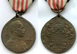 The medal is made of bronze the obverse of which depicts the right-facing bust of Wilhelm II in uniform, with the initials W II. The reverse has oak leaves on the right and a laurel branch on the left. In the center is the imperial crown which sits above the inscription DEN TAPFEREN STREITERN FÜR DEUTSCHLANDS EHRE ("The brave warriors for Germany's honor"). The ribbon is white with four thin red lines in the center and black stripes on the edges.