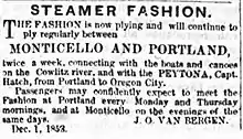 Columbia began its first trip up the Columbia on the morning of July 3, 1850, with James Frost acting as captain.[3] No one on board knew where the channel was, and the steamer's progress was slow. To act as pilots, Frost hired two young people of the Coast Salish who had been fishing on the river. By the end of the first day, they had travelled fifty miles, and Frost, not wanting to risk the vessel in the dark, tied up to the riverbank.[3] The next morning, July 4, 1850, the steamer cast off again and proceeded upstream, arriving at Portland, Oregon (then only a small settlement) at 3:00 p.m.[4] After staying at Portland for abouttwo hours, Columbia then proceeded on to Oregon City, arriving there at 8:00 p.m., where there was a celebration of the vessel's arrival.[2][4] It had taken 26 hours to make the trip.[7]