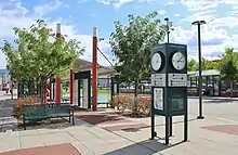 Several options for the Kittitas Street site were considered by Link Transit, including a separate waiting area for Amtrak passengers and the orientation of the bus bays.[40][41] The project was approved by Link Transit in September 1995, with a cost of $8.2 million that would be partially covered by a federal grant.[42][43] By the following year, Link Transit had acquired the property needed for the transit center for $1.5 million, including an existing three-story building that would be renovated for use by passengers, and named the project "Columbia Station".[44] Link Transit and Wenatchee broke ground on the new Columbia Station on August 23, 1996, after the Franklin House was demolished.[45] Construction costs for the project were lower than expected, allowing for Link Transit to re-add several decorative features that had been deferred in the planning process, including the street clock.[11]