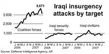 The Iraqi insurgency is the armed insurgency, by diverse groups, including private militias, within Iraq opposed to the US led occupation and the U.S.-supported Iraqi government. The fighting has clear sectarian overtones and significant international implications (see Civil war in Iraq.) This campaign has been called the Iraqi resistance by its supporters and the anti-Iraqi forces (AIF) [8] by Coalition forces.