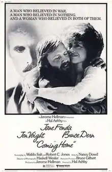 Coming Home is a 1978 American romantic war drama film directed by Hal Ashby from a screenplay written by Waldo Salt and Robert C. Jones with story by Nancy Dowd. It stars Jane Fonda, Jon Voight, Bruce Dern, Penelope Milford, Robert Carradine and Robert Ginty. The film's narrative follows a perplexed woman, her Marine husband and a paraplegic Vietnam War veteran with whom she develops a romantic relationship, while her husband is deployed in Vietnam.