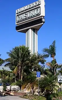 Commerce Casino is a cardroom located in the Los Angeles suburb of Commerce. With over 240 tables on site, Commerce Casino is the largest cardroom in the world.[2] Established in 1983, the casino accounted for 38% of Commerce's tax revenues for the 2006-2007 fiscal year.[3] As of 2016, the casino was providing $22 million a year in licensing fees to the city.[4]