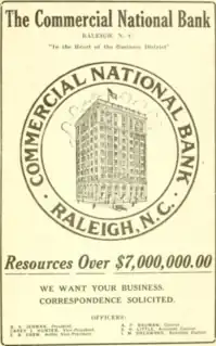 Commercial National Bank was a bank formed in Charlotte, North Carolina, on 18 February 1874, which was a predecessor to the American Commercial Bank which then helped form North Carolina National Bank. NCNB changed their name to NationsBank in 1991 and then again to Bank of America in 1999 through a series of mergers and acquisitions. Commercial National "is the oldest national banking institution in North Carolina."[1] Commercial National Bank and the American Trust Company shared a building in Charlotte prior to their merger in 1958 as American Commercial Bank.[2]