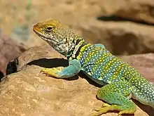 The common collared lizard (Crotaphytus collaris), also commonly called eastern collared lizard,[3] Oklahoma collared lizard, yellow-headed collared lizard, and collared lizard, is a North American species of lizard in the family Crotaphytidae. The common name "collared lizard" comes from the lizard's distinct coloration, which includes bands of black around the neck and shoulders that look like a collar. Males can be very colorful, with blue green bodies, yellow stripes on the tail and back, and yellow orange throats. There are five recognized subspecies.