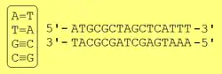 A complementary strand of DNA or RNA may be constructed based on nucleobase complementarity.[2] Each base pair, A = T vs. G ≡ C, takes up roughly the same space, thereby enabling a twisted DNA double helix formation without any spatial distortions. Hydrogen bonding between the nucleobases also stabilizes the DNA double helix.[3]
