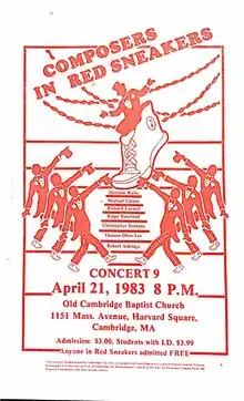 Composers in Red Sneakers was a Boston-based composers collective founded in 1981 by Thomas Oboe Lee, Christopher Stowens, Robert Aldridge, Roger Bourland, Amy Reich, and Gary Philo. Concerts were given in the Old Cambridge Baptist Church and in Harvard University's Sanders Theatre. One of their early advocates was Richard Dyer, the music critic of The Boston Globe.[1] The group appeared at Symphony Space in New York City in 1985 and produced an eponymous LP that same year.[2][3][4] Their concerts were marked by an irreverent attitude including humorous, pre-recorded introductions and skits.[5]