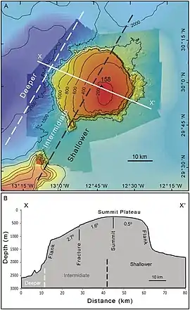 Located 90 km (56 mi) to the North-East of the Canarian Island of Lanzarote, it is the largest (in terms of surface) seamount of the CISP. Rising 2,433 m (7,982 ft) m over the sea bed, it reaches a minimum depth of 158 m (518 ft) m below sea level.[1]