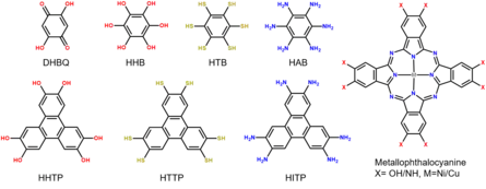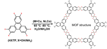 Examples include a series of isoretical catecholate-based MOFs employing hexahudroxytriphenylene (HHTP) as thee organic linker and Ni/Cu/Co as metal nodes. For the hydrothermal synthesis of these MOFs, both organic linker (hexahydroxytriphenylene) and metal ion is dissolved in H2O, aqueous ammonia is added and mixture is heated. Cu3(HHTP) also known as (Cu-CAT-1) showed a conductivity up to 2.1 × 10−1 S cm−1.[16] Another MOF based on hexaaminotriphenylene (HATP) organic linker and Ni metal ion showed an electronic conductivity of 40 S cm−1 when measured by using Van der Pauw method .[17]