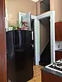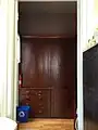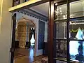The vestibule is a small space approximately 16 feet square. It's the first space encountered upon entering the home and is separated from the foyer by a double-door. The foyer contains access to the main staircase with a large carved newel post made from cherry and Birds-Eye Maple. The staircase and landings are cantilevered above the first floor and feature a continuous varnished maple railing supported by 102 turned spindles.