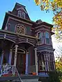 The interior features elaborate and extensive woodwork, quarter-sawn oak floors throughout the house, one of the longest cantilevered staircases on the East Coast of the United States, a large and ornate antique Eastlake-style chandelier in the dining room, and the only known existing installation of M.H. Birge & Sons block-printed peacock wallpaper ca. 1915. The home was constructed by the owners of Conklin Wagon Works, one of Olean's most important industries in the late 19th century. It was subsequently owned by the Mountain family, who operated the Mountain Clinic Infirmary, and is currently an owner-occupied single family residence not open to the public. On the morning of October 8, 2023 the house caught fire, resulting in the residents being displaced and a total loss of the historic interiors.[2]