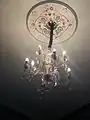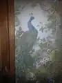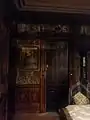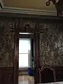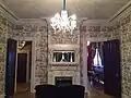 The second parlor, also known as the "drawing room" or "ladies salon" features white wallpaper depicting gnarled trees and fanciful scenes. It contains a large white tile fireplace and mantle straddled by ornately carved wooden griffons.