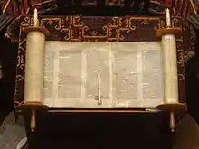 • Mantle – A piece of fabric often used to cover a Torah scroll and often made of velvet or another soft material with some type of embroidery. This is used most often by Ashkenazi communities.[1]