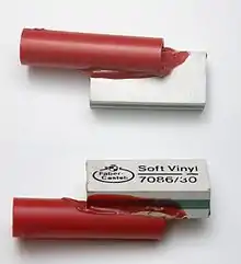Over several years, plasticizers in a soft vinyl eraser have migrated to partially dissolve a plastic pen cap.