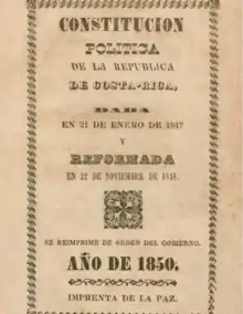 From 1838 to 1870, a large number of Constituent Assemblies with a greater or lesser degree of effectiveness, independence or legislative power were raised.[5] As is the custom in Costa Rica, after a rupture of the constitutional order that defenestrates a government, a Constituent Assembly was convened. It legitimized the new government (a custom that was maintained in 1871, 1917 and 1949). During the very unstable second half of the nineteenth century in which there were many coups d'état, the Constitutions proliferated as much as the coups, as well as their Assemblies.[5]