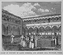 Court of Convent of Santo Domingo and Ancient Inca Fountain, ca. 1877, drawing by Ephraim George Squier.[1]