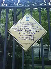 Plaque in memory to the Convent at the National Library of Spain's door.