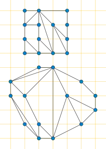 Every polyhedral graph has a strictly convex drawing,[1] for instance obtained as the Schlegel diagram of a convex polyhedron representing the graph. For these graphs, a convex (but not necessarily strictly convex) drawing can be found within a grid whose length on each side is linear in the number of vertices of the graph, in linear time.[2][3] However, strictly convex drawings may require larger grids; for instance, for any polyhedron such as a pyramid in which one face has a linear number of vertices, a strictly convex drawing of its graph requires a grid of cubic area.[4] A linear-time algorithm can find strictly convex drawings of polyhedral graphs in a grid whose length on each side is quadratic.[5]