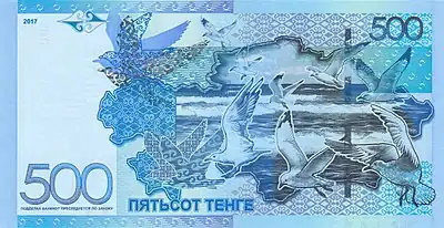 Reverse of a 500 KZT banknote, which belongs to a class of works not normally protected by the copyright law of Kazakhstan[lower-alpha 1]