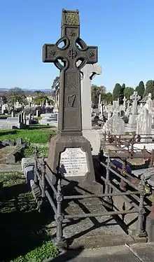 Following his death O'Mahony's funeral took place at St Mary Star of the Sea, West Melbourne and then in procession moved to his burial at the Melbourne General Cemetery. Hundreds of people, including schoolchildren, took part, many wearing green scarves. As a sign of respect and in recognition of his life and work his friends within the Irish community, assisted by Morgan Jageurs, collected funds to construct and erect a fitting memorial for him. One such method was to raffle his personal library at the cost of one shilling per ticket.[11] Shortly after his burial a carved Celtic cross made of local Bluestone was raised over the grave, its plaque bearing the inscription, "In Memory of Cornelius O'Mahony, Macroom, County Cork, Ireland, Released Political Prisoner, Died 5th March, 1879. R.I.P."