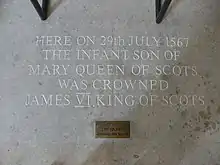At the start of the proceedings in the church Lord Lindsay and Lord Ruthven declared on oath that Mary had "resigned willingly without compulsion."[9] The Earl of Atholl carried the crown of honour, the Earl of Morton, the sceptre,[10] and the Earl of Glencairn carried the sword of honour.[11] Accounts of the ceremony mention that Adam Bothwell, Bishop of Orkney, anointed the king and the Earl of Atholl placed the crown on his head.[12] Morton pronounced the coronation oath on behalf of James, the tradition ending of the Scottish coronation service.[13] The Earl of Mar carried the 13 month old king back to Stirling Castle.[14]
