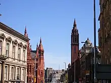 ![]() Southward view along Corporation Street – the two terracotta buildings are Victoria Law Courts to the left and the Methodist Central Hall to the right | |