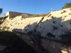 The Corradino Lines were therefore built by the Royal Engineers between 1871 and 1880, at a total cost of £17634. Part of the megalithic temple of Kordin II was destroyed to make way for the new line of fortification in 1871.[5] The defensive line consisted of a V-shaped polygonal-style trace surrounded by a ditch, stretching all the way from the Cottonera Lines to the Ras Ħanżir polverista.[6] The lines were also meant to protect the polverista, which was modified by the addition of an enclosure pierced by musketry loopholes.[7] The lines were armed with two RML 64-pound guns.[8]
