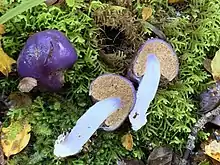 This species produces secotioid fruit bodies. The pileus ranges from 25 to 45 mm in diameter, can be pear-shaped to almost rounded with an incurved margin that is not attached to the stipe at maturity. The pileus is slimy, violet to dark violet, occasionally with a reddish hue, and is not hygrophanous. The gleba is loculate, with the locules (compartments) up to 3 mm long and ellipsoid in shape. There are white to pale violet tramal plates extending almost to the edge of the pileus. The stipe continues into the pileus as a columella. The stipe is 30–90 mm long and 8–14 mm wide, centrally attached, equal to subclavate in shape, white to pale lavender in colour, with a surface that is longitudinally striate, and having a fragile attachment to the sporocarp. The stipe context is white to white with a violaceus sheen especially at the base. The tissue of the cutis and stipe do not show any reaction to the addition of potassium hydroxide.[1] Cortinarius purpureocapitatus is distinguished from the other purple secotioid species in New Zealand by the combination of having tramal plates and smooth spores.[1]