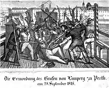 While he was crossing the Chain Bridge, an angered mob frustrated by the approaching Croatian army recognised Lamberg, murdered him, mutilated the body and triumphantly carried its pieces around, impaled on scythes.