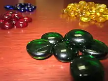 A counter is a gameplay mechanic used in collectible card games (CCG) that physically represents an effect generated by a card. It is represented by any number of small objects, usually glass beads, coins, dice, or bingo chips. They are typically placed on the card generating the counter.[1] This effect may be a count tally for keeping track of things like monitoring a life total, hit points, or a status of a card.[1]