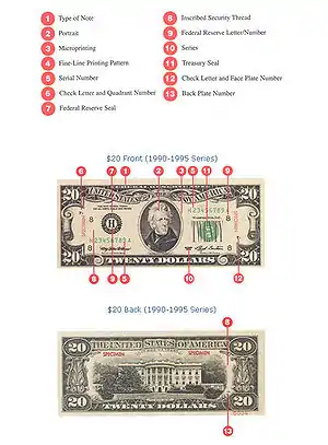Anti-counterfeiting features on a series 1993 U.S. $20 bill