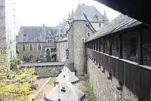The two sons of Diederik III count of Limburg Hohenlimburg and Broich, Count Willem I and brother Diederik IV shared the family property. Willem chose the Hohenlimburg for his residence and Diederick IV the Broich castle. But both retained rights to the Hohenlimburg and Broich. Count Willem I. married Metta of Reifferscheidt and had a son who died young. His daughter Margaretha married Gumprecht II. of Neuenahr, heiress of Cologne and lord of Alphen. Diederick IV. of Limburg married Henrica of Wisch, from the family of the Banner lords of Wisch in Gelre.[22] As soon as count William I died in 1459, his son-in-law Neuenahr hastened to usurp the county with Hohenlimburg Castle. He invoked his marriage treaty and had used his position to assure himself with the German Roman King Frederik that he would lend him "vom Reich zu Lehnen" with the county. Diederick's (IV) sons Willem II, Diederick V and Hendrik I undertook firm counter-action. Occupied the Hohenlimburg and had duke Gerhard of Gulik-Berg lend to them the county. The king was declared incapable of jurisdiction because Limburg was not a state-county under the king, but a fief of the dukes of Berg. The Cologne Archbishop Vincius of Mors Saarwenden broke the impasse that had arisen. With a large number of witnesses on both sides, he mediates and decides in 1460 that the county and the Hohenlimburg become a condominium with Neuenahr. That was a considerable financial loss for the Limburgs because the proceeds had to be divided from now on. But the Neuenahrs did not get what they had been after, as it turned out later.