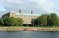 When construction began the site was within the boundaries of the city and county borough of Nottingham.[6] Boundary changes in April 1952 adjusted Nottingham's southern boundary in this area to follow the centre of the River Trent, transferring the County Hall site and other areas on the south bank of the Trent (including the nearby City Ground stadium of Nottingham Forest F.C.) to the neighbouring urban district of West Bridgford.[7]