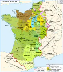 In 958, during the infancy of the Hugh's son, Hugh Capet, Theobald gathered with Count Fulk II of Anjou, who he is allied with since the last King of Brittany perished in 952. Both went so far as to present themselves as "governors and administrators of the kingdom of Neustria" and "counts by the grace of God".[21] From 960 onwards, Theobald got more strongly associated with Carolingian King Lothair, in peculiar during his war against Normandy.[22] However, he did not succeed in getting the agreement of the new Duke Hugh Capet, his direct lordship.