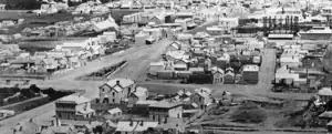 The north-eastern side of Courtenay Place was beach until the 1855 earthquake when it became swamp drained by the stream from the Basin Reserve between Kent and Cambridge Terraces.[8] The short-lived Te Aro Pa was at the higher end west of Taranaki Street and a remnant of a structure can be seen in situ at 39–43 Taranaki Street.[9] By 1870 the Pa site which once covered as much as 80 acres had been sold and subdivided. The triangle at that end was designated a Market Reserve. The inland Taranaki Street corner became Rouse Black and Hurrell’s carriage manufactory in 1859 (Hope Gibbons Ford lineal descendant) and the beachfront corner became Greenfield’s timber mill (Reading Cinemas) in 1862. The Wellington Gas Company put up its coal to gas and coke plant and gasometers on 3½ acres of reclaimed land in 1871 and their head office building beside it on the corner of Tory Street and Courtenay Place in 1898.[8] The Gas Company building is currently labelled KFC.