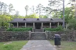 The Cove Lake Bathhouse is a historic recreational facility at the Cove Lake Recreation Area, north of Corley, Arkansas in the Ozark-St. Francis National Forest. It is a T-shaped stone structure, built of fieldstone with a gabled roof. A porch extends across the front, supported by stone piers. The roof is pierced by three triangular dormers with vents in them. It was built in 1937 with funding from the Works Progress Administration, and represents a distinctive departure from the more typical Rustic architecture produced by WPA projects.[2]
